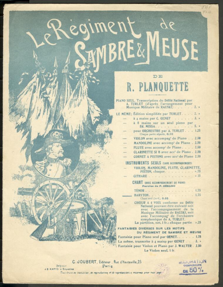 In 1871, French composer Jean Robert Planquette set Cèzano's poem to a simple melody which was to become a favorite to the French public. The lyrics were translated into many languages and the song traveled throughout the world. In 1879, Sambre et Meuse was arranged into a military march by Joseph François Rauski, and in the 1890's, pianists and orchestral arrangers also produced arrangements of the march, each giving credit lines and references to Planquette and Rauski. The popularity of this march had grown to such an extent, that it gained recognition as one of the most popular marches by a German encyclopedia. In the United States, the first copyrighted arrangements of Le Règiment were by Carl Fischer in 1904 and his band arrangement in 1908. A flurry of copyright activity followed with a flock of arrangements for piano, orchestras, men's glee clubs, and in a community song book published in Chicago. In 1937, release of Fischer's arrangement neglected to have the names of Planquette and Rauski in the credits, thus hiding the true origins of the piece.